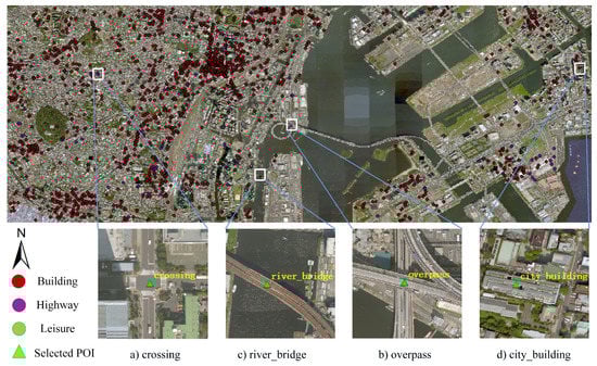 Figure 1. Superposition effect of the POI data and image. The four small maps are the categories of crossing, overpass, river_bridge, and city_building, respectively, which are used as the center points for cropping remote sensing images (the large image is part of the Shanghai area, and its spatial resolution is sub meter). - POI data screening: This screening includes the deletion of wrong annotations, removal of non-conformal objects which indicate no intersection with the Chinese national land-use classification standards (see Section 3.2), and deletion of objects which are not obvious (see below for a detailed discussion).