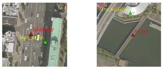Figure 2. Multi-labeling in a small candidate area. Red annotations are the retention categories, and the yellow annotations should be deleted. The left side of the candidate area shows “highway”; “bus_stop”, and “bus_stop” should be removed, due to their small size and unclear recognition. The right side of the candidate area shows “bridge”; “city_building” should be removed due to its lack of salience and as it is smaller than the bridge. This may not be the case for another image, where city_building may be dominant. - For some POI data, the names of the objects are not exactly matched with those of the remote sensing image objects. For this phenomenon, we delete the POI data directly. (Figure 3).