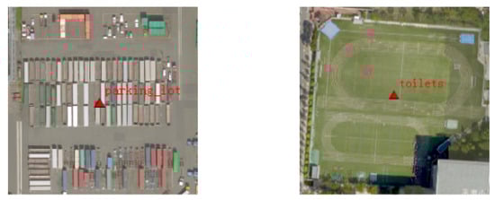 Figure 3. Candidate area error labeling phenomenon. The red label is the wrong category for the images. The left area should be labeled as “container”, not “parking_lot”. The right area should be labeled “artificial_grassland”, not “toilets”.