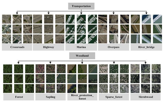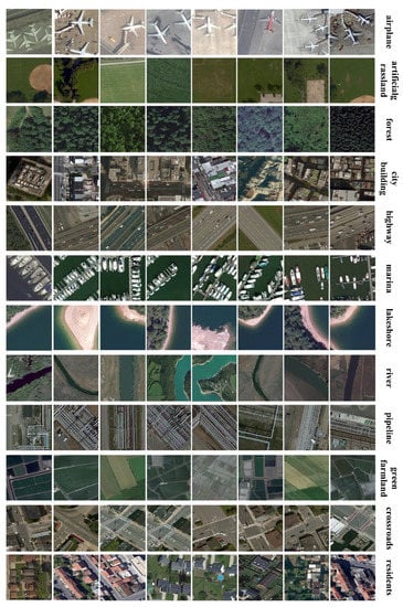 The purpose of remote sensing image classification is to extract important and significant feature types from images []. However, given the complexity of the background environments in remote sensing images, as well as the diversity of the feature categories and other external conditions of the objects, such as shape, size, color, and other factors, determining the categories of objects, then classifying and ensuring the rationality and practical significance of the categories are key points in constructing a remote sensing image benchmark.