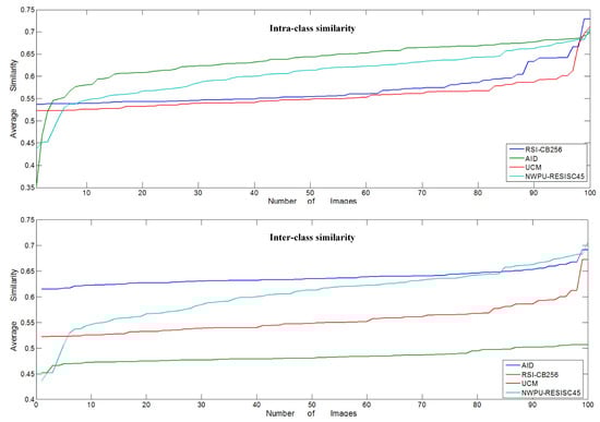 We randomly selected the sample categories ‘river’ and ‘parking’ among the four benchmarks, with 100 images for each category based on the number limit of the UC-Merced benchmark to calculate the inter- and intra-class similarity between the categories. We calculated the similarity between each of the images with any other image, then averaged the values. Figure 8 shows the results of the similarity measurement among the four benchmarks; for the inter-class similarity measurement, it shows the average similarity of ’river’ and ‘parking’. As the figure shows, RSI-CB256 had lower inter-class similarity than the existing, relatively large benchmarks AID and NWPU-RESISC45, but was a little higher than UC-Merced. However, RSI-CB256 obtained the lowest intra-class similarity, compared to the other benchmarks, which was in the range of 0.45–0.51.
