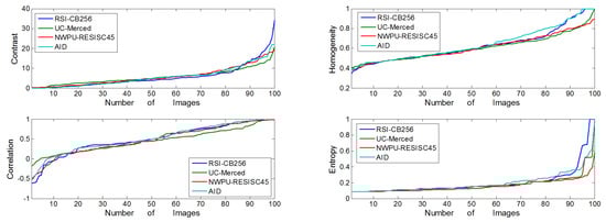 The co-occurrence matrix is defined by the joint probability density of the pixels at two positions, which not only reflects the distribution characteristics of the luminance but also the position distribution characteristic between pixels with the same or similar brightness, which forms the basis for defining a set of texture features. In order to be more intuitive in describing the texture of the co-occurrence matrix, we described the following four parameters separately: (a) Contrast, which reflects the image sharpness and texture of the extent of the groove depth, the deeper texture groove means the greater contrast and the higher clarity; (b) Homogeneity, which measures the degree of local changes in image texture, wherein a larger value means the image textures of different regions lack changes; (c) Correlation, which reflects the local gray image correlation, when the matrix pixel values are equal, the correlation value is large; to the contrary, if the matrix pixel values vary widely, the correlation value is small; and (d) Entropy, which represents the complexity of the information within an image. Figure 9 shows the values of the four parameters mentioned above among the four benchmarks; they have almost the same trend among them, but the contrast, correlation, and the entropy information of RSI-CB256 were relatively large, indicating that the RSI-CB256 image is clearer for recognizing objects and features. Furthermore, the high entropy suggests more complex images which, to some extent, reflects stronger diversity.