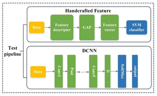 - Model selection: handcrafted feature models versus DCNN (learning feature) modelsWe used traditional handcrafted features and DCNNs based on end-to-end learning features as the test pipeline to test the performance of different methods on RSI-CB. As shown in Figure 10, for handcrafted features, we used SIFT [], Color Histograms (CH), LBP, and GIST as the description operators and global mean pooling to construct the eigenvectors for these methods. Finally, the SVM model was employed to classify the images. For the end-to-end learning features, we used AlexNet [], VGG-16 [], GoogLeNet [], and ResNet [] to train RSI-CB. Figure 10 shows the test pipeline for RSI-CB. The top half of the figure introduces the test pipeline with handcrafted features. The bottom half of the figure shows the test pipeline with DCNN.
