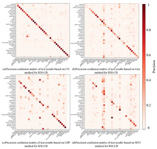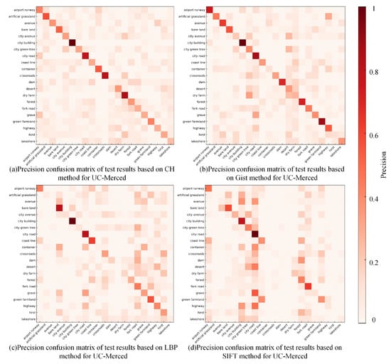 The performance based on handcrafted features on UC-Merced, as shown in Figure 13, was much worse than the test results in RSI-CB, where only few categories reached a precision of 0.8. The main reason for this lies in the obvious scale advantage of the RSI-CB benchmark. In addition, RSI-CB is an object-centered benchmark for most categories, whereas UC-Merced is based on complex scenes for most categories. Each image contains more complex information and robust visual features.