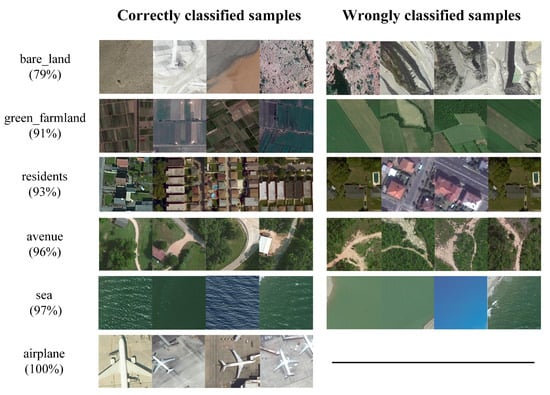 SAT-4 and SAT-6 are another two important benchmarks for remote sensing classification, which were collected by the National Agriculture Imagery Program (NAIP) []. The aerial images of these benchmarks were obtained from rural, urban, densely forested, mountain, water, and agricultural areas in California. SAT-4 and SAT-6 consist of six categories—bare soil, vegetation, grassland, road, house, and waterbody—which cannot achieve the purpose of remote sensing image recognition in practical applications. SAT-4 and SAT-6 have 500,000 and 405,000 images, respectively. The image patches are sized pixels, which is very small. Hence, the details of the internal image are insufficient. The small block size cannot reflect the complex distribution of features completely, and the image may contain only the local features of objects.
