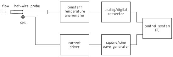 The tested anemometer consists of a hot-wire sensor connected to an electronic constant-temperature system. The output signal from the anemometer through the analog–digital converter is fed to the measurement control system (PC). This system also controls a generator that creates a test signal. The signal from the generator through a current amplifier supplies the induction coil located near the hot-wire sensor. It is important to select the position and parameters of the coil to ensure permanent inductive coil-sensor coupling and the appropriate frequency bandwidth of this coupling. The hot-wire sensor was placed in the reference flow, which allowed determination of the frequency bandwidth of the anemometric system at different velocities. The measurement methodology is almost the same as for standard tests with a signal connected directly by wire to the anemometer electronic system.