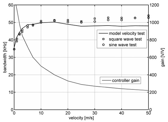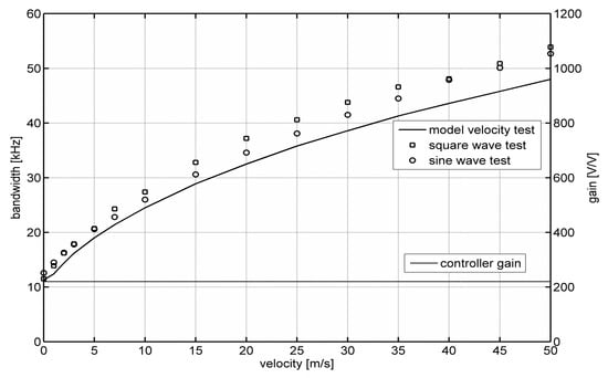 Figure 4 shows the dependence of the bandwidth of a constant-temperature constant-bandwidth anemometer on flow velocity. Figure 4 shows the results obtained using square and sinusoidal tests. The solid line marks the results obtained in the numerical modeling process using the methodology and model from [16,17,18]. Figure 4 also presents changes in the constant-temperature controller gain, k, allowing for the implementation of the constant-bandwidth operation.