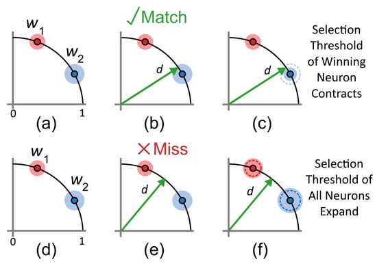If the input does not match any existing feature, as in Figure 2e, the input is discarded and the thresholds for all features is increased by . This has the effect of increasing the receptivity of all features making them more willing to accept input ROIs with greater distance to their current location in the feature space. Thus, with each ’missed’ input event, the network as a whole becomes less selective and more receptive to change.