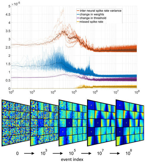 As the early highly receptive neurons contract their thresholds and become more selective, more neurons with more selectively initialized thresholds become activated and begin learning. This learning results in an increasing rate of change in the feature weights and the selection thresholds. Even greater change is observed in the variance of the output spike rate across neurons, as more and more neurons become activated while the most selective neurons have still not fired a single output. Eventually, as the number of activated neurons with decreased thresholds increases to a tipping point, the magnitude of the change in thresholds begins to decline as fewer and fewer highly receptive neurons are left for adaptation. Simultaneously, the change in weights and the variance in the spike rate of the neurons also falls, as the neuron weights and thresholds begin to take on the statistics of the input dataset such that the neurons orient toward the centroids of the most common spatiotemporal pattern clusters while the thresholds take on values in proportion to the spread of the patterns around these centroids. Eventually all neurons become so selective that some input events start to fall outside the selection threshold, causing the first missed spikes. With these missed spikes the thresholds of all neurons increases causing the final most selectively initialized neurons to respond to input and begin adapting their weights. After this point all signals move toward their final steady state values demonstrating the convergence of the network. In this state the change in weights and thresholds and inter neuron spike variance reach their lowest value, while the missed spike rate reaches a steady state of approximately 2 percent.