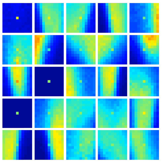 Feature Extraction with Adaptive Selection Thresholds (FEAST) Features for the Plane Dropping dataset. The 25 spatiotemporal features produced when using the FEAST algorithm on the Plane Dropping dataset. Note that the plane dropping demonstration only uses the ON polarity due to the low Signal-to-Noise-Ratio (SNR) in the OFF events. Specific features can be seen coding for the leading edge of the airplane nosecone and for the wings. There are multiple features that code for noise events, as can be seen by several near-empty features. The colors used to represent the features are indicative of time, as these features represent complex spatiotemporal patterns.