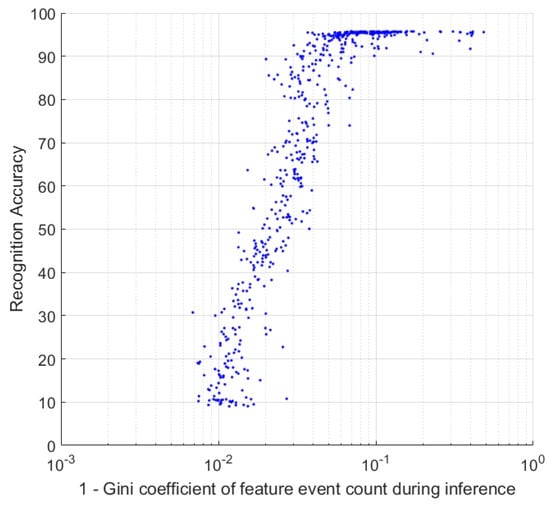 Figure 9 shows the strong, though nonlinear, relationship between the Gini coefficient and classification accuracy for two thousand random, independently parameterized feature sets. Each data point represents results from a feature set instantiated with random threshold parameters, feature sizes, learning rates, training dataset size, and surface decay constants. The results cover almost the entire accuracy range from chance accuracy to the highest optimized accuracies achieved in this work on the N-MNIST dataset. Yet across the entire accuracy range, the relationship between accuracy and the Gini coefficient is remarkably robust, suggesting that the Gini measure can provide a reliable rapid evaluation and comparison of feature layers, without the need for further processing and computation. Not only is the Gini coefficient useful during the algorithm design stage, where many of the interdependent parameters of the larger system need to be instantiated, but can also serve as a reinforcement signal in online learning applications, by quantifying in real-time the relevance of a feature set to any batch of observed data.