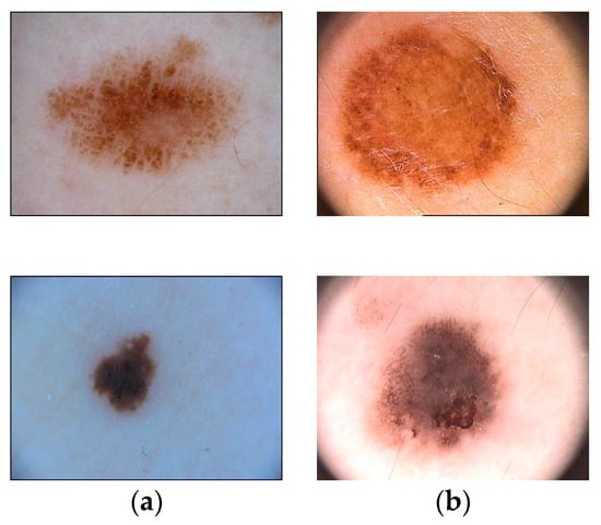 We trained and tested our CNN model on dermoscopic skin images acquired from two publicly accessible datasets (i.e., PH2 [42] and ISIC 2017 [43]), the latter provided by the “International Skin Imaging Collaboration” (ISIC). Example images from both datasets are shown in Figure 1.