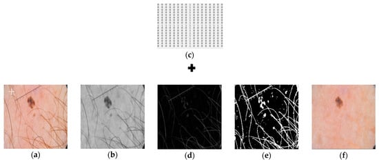 The image obtained after applying the closing operation on a grayscale image is subtracted from the image itself to obtain hair like structures. Binary mask of the hair elements is obtained by applying a threshold value of “10” on the image obtained from the black top-hat filter. Images obtained from the black top-hat filter and after thresholding, respectively, are highlighted in Figure 2d,e.