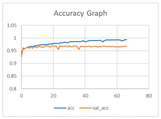Training and validation accuracy of the proposed convolutional neural network model for 70 epochs.