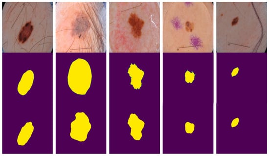 The model was tested on the validation and test set taken from the ISIC 2017 dataset. Furthermore, the model was also tested on the PH2 dataset comprising of 200 dermoscopic images. The ground truths were also available in order to check the performance of the proposed CNN model. All images went through the preprocessing step before being fed into the CNN architecture as described earlier. Parameters of convolutional layers were set during the training process. During the evaluation process, the model parameters were not changed in order to assess our model’s performance on the pre-set parameters. The results of multiple subjects are shown in Figure 5.