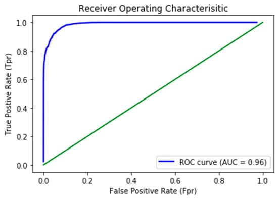 The ROC curve dictates the model’s capability to distinguish between classes accurately. The higher the area under the curve, the higher the network’s ability to distinguish two classes more precisely (i.e., either 0 or 1). The AUC of our proposed model was 0.963, illustrating the model’s remarkable competence of differentiability.