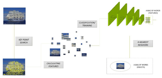 The proposed idea consists of extracting small fragments of the image with certain features. All points are divided against a certain metric into smaller images containing a fragment of the object. Such images can represent everything, because the object can be on any background; for instance, a ship can be captured in the port or against a background of trees; in that case, smaller images can even show some trees. Thus, the use of a classical approach, that is, the creation of a bag-of-words using an algorithm such as k-nearest neighbors, is not very effective. The reason is the lack of connection between the features (in smaller parts), because it should be considered that the objects can be on different scales or turned at a certain angle or even have some noise, such as bad weather or additional objects. That is why we propose a bag-of-words model based on more complex structures, such as neural networks.