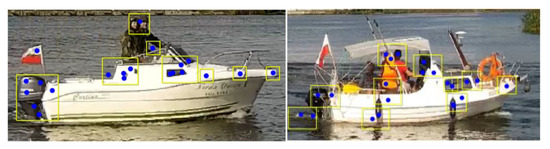 The main idea of this study was to extract features using one of the classic algorithms for obtaining keypoints, such as scale-invariant feature transform (SIFT) [21], speeded up robust features (SURF) [22], features from accelerated segment test (FAST) [23], or binary robust invariant scalable keypoints (BRISK) [24], and then create samples with found features. It should be noted that if these algorithms processed the original image, the found points would probably cover the entire image; in the case of a simple image where a ship is at sea, all points could be placed on this object or water or waves, but there may be an image with some additional background with many possible points. To remedy this, in the first step, the image must be processed, which means using graphic filters to minimize elements such as edges or points. We used only two filters, such as gamma correction and blur.