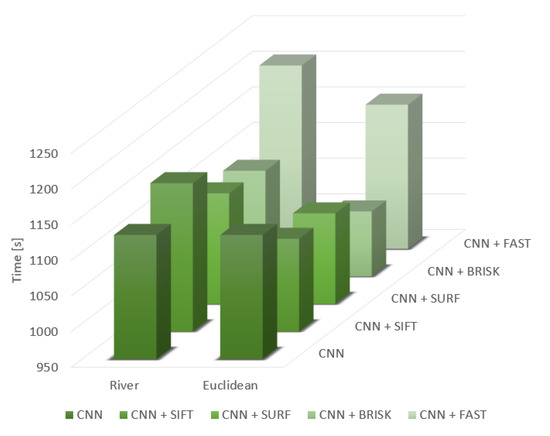 The presented results are averaged data from 10 tests. In general, using the Euclidean metric saves approximately 10% more time than using the river metric. The tests showed that the longest processing time occurred using the FAST algorithm and the shortest with BRISK. As for the SIFT and SURF algorithms, the time measurement was at a similar level and was classified as in the middle.