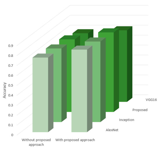 We used other CNN architectures, including VGG16, Inception, and AlexNet, and compared the results with and without our approach, as shown in Figure 4.