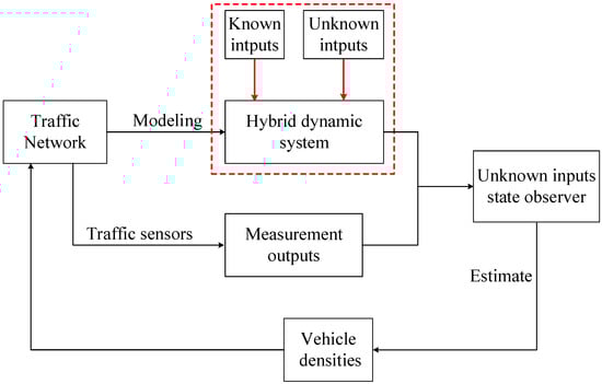 Estimation of traffic flow density is the basis of many transportation applications, such as route planning and vehicle routing [39,40,41]. For example, based on the estimation of the traffic flow density, the distribution of traffic congestion in a road network was identified, and then, alternative routes were assigned for selected vehicles to avoid congested roads [39]. Typically, traffic network can be modeled as a hybrid dynamic system by means of multi-mode switching [11]. However, most of the existing state observers were designed on the basis of the ideal traffic flow dynamic model, where both the system disturbance and the measurement noise were not taken into consideration in the modeling procedure. Especially, the inputs were treated as measurable signals and were known in advance. Hence, these types of observers are termed known-input state observers. From a practical viewpoint, system disturbance and measurement noise always exist in the actual traffic flow network, and these input signals are often unknown but cannot be ignored. In order to estimate vehicle density for real-world freeway segments, a traffic flow model should include system disturbance and measurement noise. However, few studies have systematically addressed the vehicle density estimation problem with unknown inputs. It is crucial to explore a more effective way to solve the design challenge of the unknown-input state observer on the basis of the hybrid dynamic traffic network model. To this avail, this paper introduces a switched unknown-input state observer to reconstruct vehicle densities of segments of a highway system which maintains field data measurements by using traffic sensors for only a fraction of segments and limited known inputs. Compared with other existing methods, the proposed dynamic model has the following advantages: (1) it is more realistic in representing the actual traffic networks and (2) the actual vehicle densities can be readily reconstructed using the unknown-input state observer.