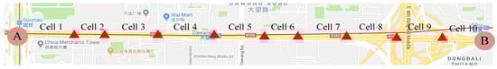 Figure 3 presents the segment of Jingtong Freeway, Beijing, China used for methodology application, particularly the design of an unknown-input state observer for analyzing traffic states to reconstruct vehicle densities essential to traffic flow modeling. The west–east directional freeway segment is labeled as segment AB and encompasses four on-ramps and four off-ramps, respectively labeled in ascending order from 1 to 4. The directional segment AB is partitioned into 10 cells marked from 1 to 10 correspondingly. Table 1 and Table 2 list the details of the cell lengths and pertinent parameters of vehicles’ operational characteristics.