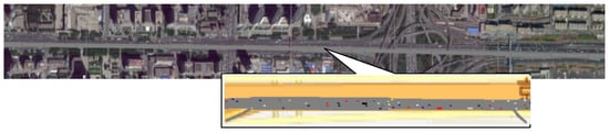 Figure 4 depicts a VISSIM-based simulation model developed for the directional segment AB to generate simulated traffic stream data [42]. The simulation execution period was 3 h in a typical weekday from noon to 3:00 p.m., with a data reporting interval of 5 s. Virtual traffic-counting sensors were placed in each cell to collect data on vehicle densities used to verify the accuracy and precision of traffic state estimates from the reduced-order unknown-input state observer. In addition, virtual traffic-counting sensors were installed in the on-ramp Section 2 and Section 3 to collect traffic data as known inputs. Conversely, on-ramp Section 1 and Section 4 were not equipped with traffic-counting sensors and could be treated as roadway sections with unknown inputs.