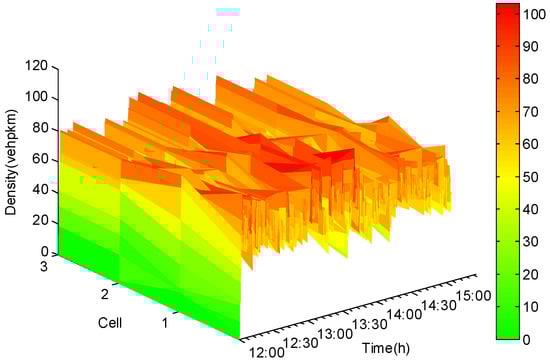 As sufficient and necessary conditions for the existence of the unknown-input state observer, the pair must be observable or detectable. In this respect, traffic-counting sensors were installed in cells 2, 3, 4, 5, 6, 8, 9, and 10, which facilitated collecting data on vehicle densities that were subsequently used to design the observer. Therefore, the output matrix C = [ci,j] was a 7 × 10 matrix, and , with all other entries of the matrix set to zero. With virtual traffic-counting sensors installed in cells 2, 3, 4, 5, 6, 8, 9, and 10, data on vehicle densities of those cells could be directly collected. For the remaining cells including cells 1, 5, 7 without virtual sensors, vehicle densities associated with them needed to be derived based on traffic states estimated by the reduced-order unknown-input state observer. Figure 5 and Figure 6 show the simulated and estimated vehicle densities for multiple cells evolving over different time points of the analysis. Using a color-coding mechanism of green, yellowand red, vehicle densities would increase from green to yellow and then to red, representing free-flow to capacity and then to congested traffic stream conditions. As the red color becomes darker, it shows more severe traffic congestion.