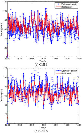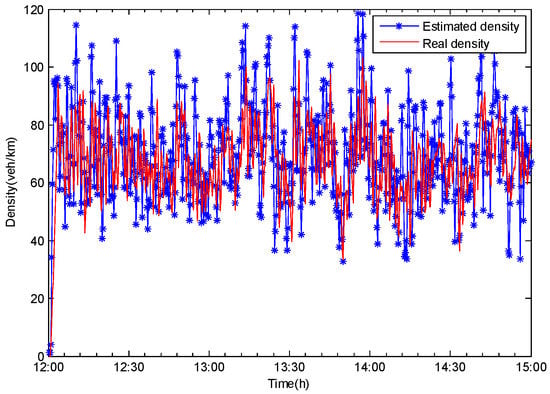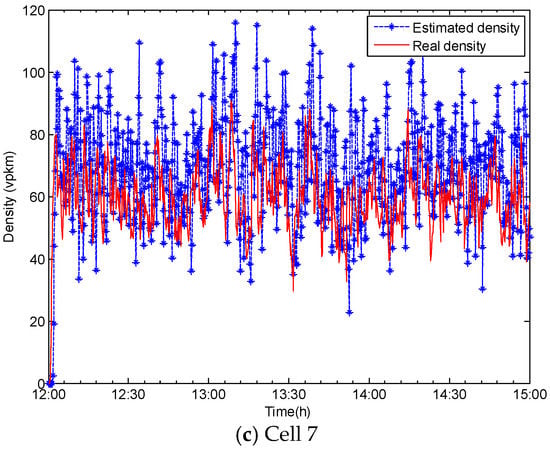 In our case, on-ramp traffic flowed into cell 1. The on-ramp traffic volume was 10% of the cell 1 traffic. The prediction results for cell re ias shown in Figure 8. As can be seen, the proposed model was still effective for traffic density prediction. However, compared to Figure 7a, because the traffic flow on the main road was affected by the on-ramp vehicles, the estimated accuracy of vehicle density determination was reduced by 15%. As a result, it was crucial to consider the influence of other streets on traffic flow and develop related observer functions to reduce it and improve the accuracy of the prediction model. This coupled-street issue will be addressed in our next work.