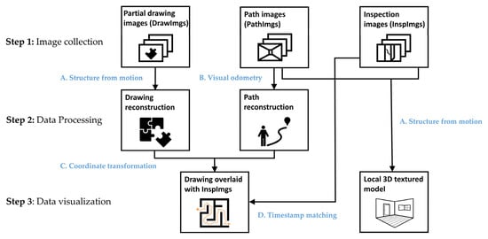 An overview of the technical approach is shown in Figure 1. The technique consists of three main steps including image collection, data processing, and data visualization, and implements four algorithms (marked as A–D) into the process to generate two outcomes: a drawing overlaid with InspImgs and a local 3D textured model in Step 3. In Step 1, as the input for the proposed technique, engineers collect three types of images from the building including InspImgs, PathImgs, and DrawImgs. InspImgs are the data being collected in the field, aiming to capture buildings and their components for the purposes of visual assessment and documentation. Collected concurrently with InspImgs, PathImgs contain an image sequence recorded continuously in time in order to capture the scene in front of the engineer as he/she walks through the building and thus document the path taken. Thus, PathImgs are not selectively captured by focusing on specific objects or damage, like how InspImgs are captured. PathImgs and InspImgs are synchronized in time, used for later localization. DrawImgs are part of the metadata captured using images [19]. DrawImgs contain a portion of a physical drawing while preserving its details. In the proposed technique, in addition to InspImgs and DrawImgs, which are normally captured in a typical reconnaissance mission, engineers simply collect PathImgs by mounting an extra camera on a hard hat or body.