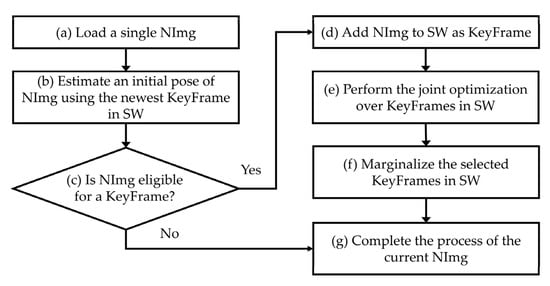 In Step (a), a single NImg is fed into the algorithm. Then, an initial pose of that NImg is roughly estimated by matching the points on the newest existing KeyFrame in SW. With the outcomes from Step (b), a series of strategies are applied to decide whether or not NImg can serve as a new KeyFrame in SW. This decision is based on, for example, i) whether or not the field of view has changed since the most recent KeyFrame, which is measured the mean square optical flow from the newest KeyFrame to NImg, ii) a camera translation has caused an occlusion or disocclusion, which is measured by the mean flow without rotation, or iii) the camera exposure time has changed significantly, which is measured by the relative brightness factor between the newest KeyFrame and NImg [38]. A condition for candidacy as a new KeyFrame is the image having a large relative movement from previous KeyFrames. In Step (c), if the NImg is not eligible for a new KeyFrame, the NImg only contributes to update the depth values of inactive points in SW, which are the points used for the future joint optimization. The NImg assigned as non-KeyFrame is not involved in the optimization process for point cloud and pose update. If NImg is qualified as the new KeyFrame, the NImg will be added into SW in Step (d). Subsequently, a joint optimization is performed, which is the core part of DSO in Step (e). The technical details of this process are delineated in the following paragraph. In short, the intensity difference between the points on the newly added KeyFrame and the existing KeyFrames in SW is minimized using the Gauss-Newton method for parameter optimization. Once the new KeyFrame is added in SW and successfully registered in the existing model, in Step (f), we deactivated some KeyFrames in SW, which will not contribute to the upcoming match with NImg. This process is called marginalization and helps to maintain a consistent number of KeyFrames in the SW, thereby improving the efficiency of the optimization in DSO. Finally, in Step (g) the operations related to the current NImg ends, and the same process is then repeated for the next NImg.