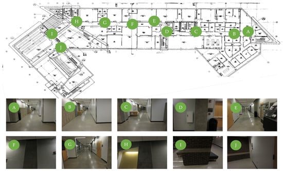 Experimental verification was performed on an actual building. We chose the basement floor of Armstrong Hall on the Purdue University campus as a test site, shown in Figure 4a. The area of the basement floor was about 175 m × 60 m and its digital drawing including sample images of key places is presented in Figure 4b. A long corridor of 175 m (long) by 3 m (wide) was located along the centerline of the floor, marked as solid blue in Figure 4b. Since the corridor was sufficiently long and had several turns to walk through, and the structural columns were exposed in the corridor (see Figure 4b), the scenes in the test site do represent the actual building environment that engineers would visit after earthquake events. We collected necessary images including InspImgs and PathImgs by emulating inspection and data collection steps taken in a typical post-earthquake field reconnaissance mission.