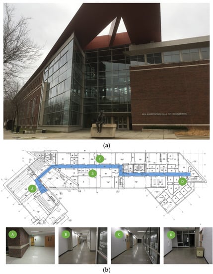 Experimental test site (Armstrong Hall at Purdue University, United States): (a) building overview and (b) basement floor plan: InspImgs and PathImgs are collected along the corridor highlighted as solid blue. Sample images corresponding to key spots in the corridor are provided.