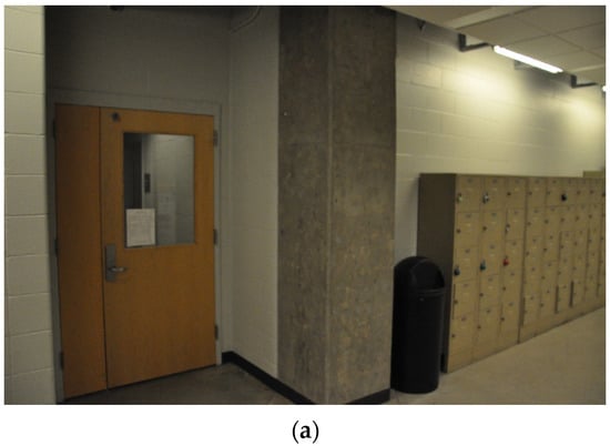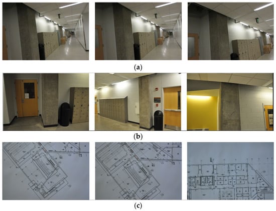 We manually collected PathImgs using a compact camera (Canon 350HS), InspImgs and DrawImgs using a DSLR camera (Nikon D90). The size of the Canon 350HS was 3.92 inches × 0.9 inches × 2.28 inches, and the weight was 5.19 ounces. Overall, 3687 PathImgs, 232 InspImgs, and 44 DrawImgs were collected, and their resolutions were 2595 pixels × 1944 pixels, 4288 pixels × 2848 pixels, and 4288 pixels × 2848 pixels, respectively. Their sample images are shown in Figure 5. The compact camera was set to burst mode, which continuously took PathImgs at 7.8 fps. The focal length was fixed throughout the entire experiment because the initial calibration parameters remained unchanged. We avoided the jelly effect in this experiment by simply walking slowly, at about 1/3 of the normal walking speed of a human. By doing this, we did not notice an obvious jelly effect, and if there were, the errors did not influence the quality of the result. Additionally, the Canon 350HS is just one sample of a suitable camera to collect PathImgs and a baseline for choosing the camera device. By using cameras with faster shutter speeds with high ISO, one can avoid the need to walk slower. In this experiment, two people collect InspImgs and PathImgs at the same time. However, the actual collection of PathImgs is devised to be automated with a mountable camera (e.g., action camera) by a single engineer. The DSLR camera was used to collect InspImgs and DrawImgs. A major distinction between InspImgs and PathImgs is that PathImgs represent a stream of image sequence without gazing at any specific objects or regions that the engineers would be interested in, while InspImgs are non-periodic image shots targeting objects-of-interest at various viewpoints and distances. For instance, assume that the engineer gazes at interesting objects (e.g., columns and walls) or certain evidence of damage (e.g., crack and spalling), PathImgs and InspImgs capture different information: PathImgs, as in Figure 5a, captures the views in front of the engineer, regardless of whether the compact camera is directly facing any particular building components of interest. The scenes in these images will turn upwards or downwards following the gaze of the engineer. On the other hand, InspImgs, as in Figure 5b, were aimed at the objects and regions that the engineer found interesting and chose to document.