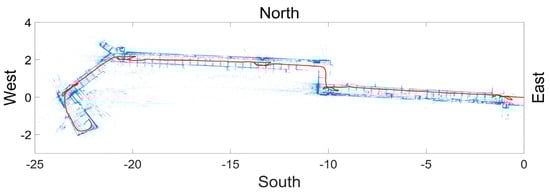 Figure 6 shows the reconstructed path and 3D point cloud, which were viewed (or projected) in the gravity (height) direction. Most PathImgs were normally captured while the gravity direction was aligned with the image height. Thus, we could easily compute the gravity direction of the reconstructed model for projection. In Figure 6, each red point indicates each PathImg location (although they look as if they were connected) and blue points were the point cloud (for a black and white figure, the line passing through the middle of the encompassed region was the set of red points.) A majority of points (blue points) were likely generated from the perpendicular features adjacent to the corridors like walls or doors. Thus, the blue points formed a layout of the walls along the corridor.