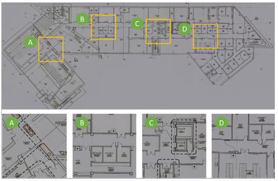 The drawing reconstruction method is implemented to the collected DrawImgs and the resulting reconstructed image of the structural drawing is present in Figure 7. The overall quality of the drawing was quite satisfactory, and as was clear from the enlarged areas next to the full drawing. All detailed were preserved, even small texts and thin lines. The color and orientation of the reconstructed drawing in Figure 7 were manually tuned for better visualization. It should be emphasized that this method possessed the ability to automatically restore multiple drawings from a mixed set of DrawImgs that included images of more than one drawing. However, in this experiment, we only reconstructed a drawing for a single basement floor using the corresponding DrawImgs. Additionally, if the digital drawing is available, such a drawing reconstruction step can be skipped. This digital drawing was used directly for the overlay step as in the next section, replacing the reconstructed drawing image.