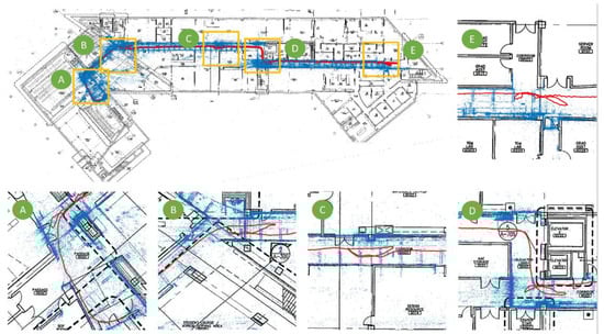 Following the steps explained in Section 3.4, we selected 10 PathImgs and their corresponding positions in the reconstructed drawing for computing the transformation matrix. The transformation matrix was used to map the point cloud and PathImg locations (in Figure 6) to the reconstructed drawing (in Figure 7). The reconstructed drawing overlaid with the point cloud is shown in Figure 8. The overall result was quite accurate. A majority of blue points were well aligned with the corridor wall boundary on the drawing. Note that we did not conduct a quantitative evaluation of the mapping result because it was sufficient to identify approximate locations of PathImgs for the purpose of documenting the path of the engineer and associating specific images with that reconstructed path and the structural drawing. Here, the reconstructed drawing image in Figure 8 was the binary image converted from the drawing image in Figure 7 so that the line and text in black were clearly legible.