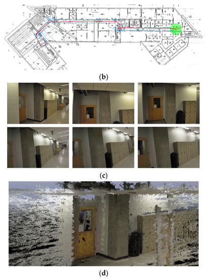 The image data collected was intended to cover the entire corridor area highlighted in Figure 4b. We followed the image collection guideline introduced in Section 3.1. The compact and DSLR cameras were set to have the same timestamp before conducting the experiment. We spent 11 min and 45 s to collect both InspImgs and PathImgs by walking through the entire corridor and performing inspection actions, such as observing structural conditions and taking more photos of structural elements, which is to emulate an actual post-earthquake reconnaissance mission.