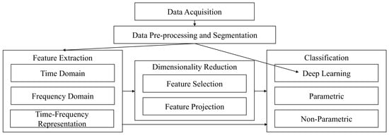 The various stages of an EMG pattern recognition system are consistent across the literature, and are comprised of: data acquisition, pre-processing and segmentation, feature extraction, dimensionality reduction, and classification [,], as shown in Figure 1. While each of these stages influences the performance of the control system, the quality of the data itself is paramount in order for true motor intent to be decoded from the EMG signal.
