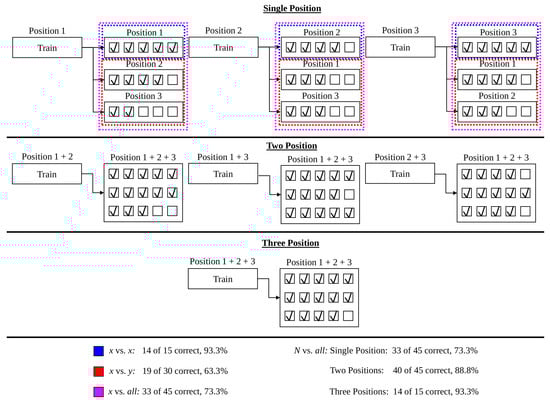x vs. all (single-position): The results of the x vs. all testing framework illustrate the performance that might be expected during regular operating conditions when trained using a single position, as is commonly seen in clinical and laboratory settings. As expected, the x vs. all testing framework experienced a large decrease in accuracy and precision compared to x vs. x, but significantly outperformed the x vs. y framework. A degradation in performance of 9.5%, 10.5%, and 18.4% was found compared to the intra-position case for the 5 limb position, 16 limb position, and 3 forearm orientations datasets, respectively.