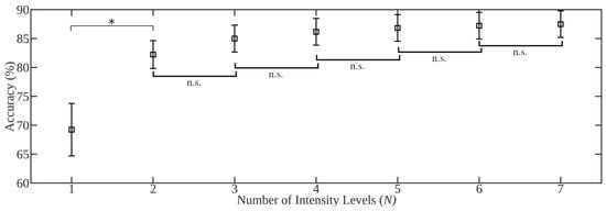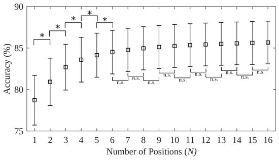 Mean classification accuracies (%) when training with N positions in the N vs. all testing framework using the 16 limb position dataset, the TD feature set and the LDA classifier. Error bars indicate standard error measurements across subjects. Significant differences were denoted by * when the p-value was less than 0.05, whereas n.s. indicates no significant difference.