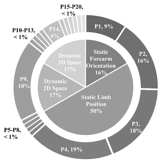 The most commonly reported limb position experimental protocol in the literature is one that uses static limb positions [,,,,,,,,,,,,,,,,,,,,,,,]. Among the articles surveyed, these make up 50% of all experiments. This protocol prompts subjects to conform to specified wrist, elbow, and shoulder joint angles to reach a characteristic position, commonly those purported to occur during daily activities. While remaining in the desired position, subjects perform repetitions of hand and wrist motion classes. Across the static limb position literature, the average number of positions collected is 8, with a maximum of 91. The most commonly employed positions were P4, P3, P9, P2, P1, and P14 (Figure 4), in descending order of frequency.