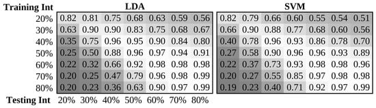 The performance of these datasets indicates the amount of variability introduced across the positions surveyed. While the degradation in performance of the 16 limb position dataset was greater than the 5 limb position dataset, it should be noted that it also contained fewer channels of EMG (Table 1). Also, given that it included more positions, the proximity of neighboring positions to one another was closer than those of the 5 limb position dataset. Post-hoc analysis with Bonferroni correction of the classifier factor revealed significant differences between the kNN classifier and all other classifiers, with an average accuracy of 79.4%, 77.9%, 77.1%, 76.8%, and 68.0% for the LDA, RF, QDA, SVM, and kNN classifiers, respectively. Lorrain et al. [] also determined that an LDA classifier was the best candidate using the TDAR feature set for motion recognition in the presence of confounding factors with more than 6% improvement when factor-specific variability was introduced to the training set. This is likely because the use of a common (pooled) covariance promotes more general decision boundaries than other discriminative classifiers []. Conversely, the SVM classifier is known to perform well with the wavelet feature set [,], likely because it explicitly integrates structural risk minimization. Of note, post-hoc analysis revealed no significant differences between feature sets. This is not to say that features do not affect performance, but that the chosen feature sets have all been validated in myoelectric control and possess meaningful and robust discriminatory information.