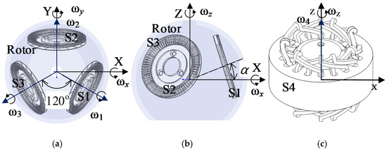 As shown in Figure 4c, the electromagnetically-driven stator is mounted outside the spherical rotor. The rotor torque is generated by the interaction between the energized coil and the PM magnetic field. The 3-DOF motion is achieved by the synthesis of four stators motions. ωx, ωy, and ωz are defined as the angular velocity vectors of the rotor rotating around the X, Y, and Z axes, respectively. According to the motor structure, the relation among ω [ωx, ωy, ωz] and the angular velocity vectors ω1, ω2, ω3, ω4 of the four stators can be expressed as: