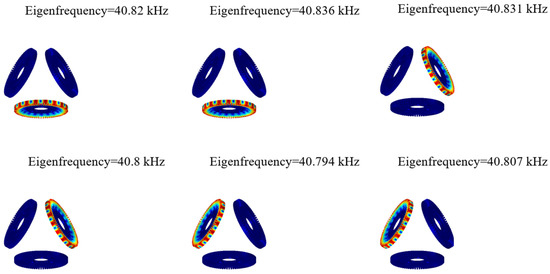 As shown in Figure 6, when the outer radius is 53.5 mm, the rotor structure has two resonant modal modes with frequencies of 39.987 kHz and 41.72 kHz. The motor does not have any natural (Eigen) frequency between 40–41 kHz when the wqR is 53.5 mm. Then it can be concluded that the working frequency of the motor is not close to the resonant frequency.