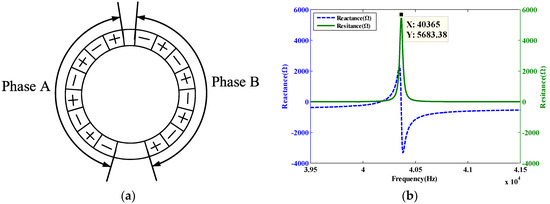 By using the solid mechanical analysis module in the COMSOL finite element analysis software, a voltage load is applied to the piezoelectric ceramics of the stator, and the form of the load is a plural form. The magnitude of the voltage on one side of the piezoelectric substrate is 0 V, and the magnitude of the voltage on the other side is 200 V. The layout of the applied load is shown in Figure 8a. The excitation voltage applied by phase A is 200 × exp(π/2 × i), and the excitation voltage applied by phase B is 200 × exp(0 × i). From the modal analysis results in Figure 5, the piezoelectric stator frequency is about at 40 kHz, so the frequency domain analysis is performed with 39.5–41.5 kHz. The frequency domain analysis result of the piezoelectric stator obtained by post-processing is shown in Figure 8.