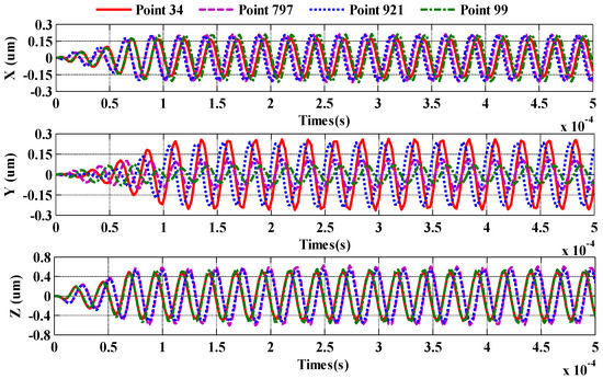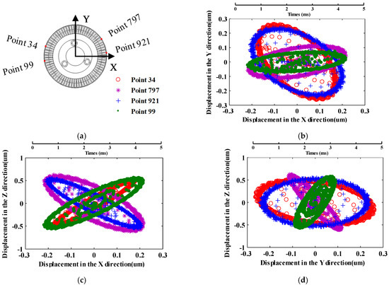 The movement of the motor stator at 0–5 ms is shown in the Figure 9. Four points in the piezoelectric stator drive boundary are selected, which is used to analyze the stator vibration characteristics, as shown in Figure 9a. It can be seen from Figure 9b–d that the trajectory of piezoelectric stator particle displacement is not elliptical at the beginning of the applied excitation. The displacement of the piezoelectric stator particle on the X-Z and Y-Z planes gradually increases, eventually reaching the maximum. Currently, the motion track of the particle becomes an elliptical.