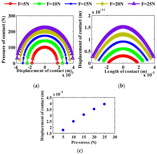 According to the data in Table 2, from Equations (7) and (8), we use MATLAB software to numerically simulate the contact pressure and contact surface distribution of the stator and rotor of the motor. The piezoelectric stator-rotor contact displacements calculated with the parameters are shown in Figure 12a–c. It can be seen from Figure 12a–c that the greater the pre-pressure, the greater the length of the rotor contact. The greater the pre-pressure, the greater the displacement of the pressure contact point. The greater the pre-pressure, the greater the pressure at the contact point.