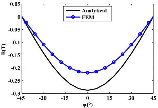 In order to verify the accuracy of the magnetic field analysis, the air gap magnetic field at the distance of 0.5 mm from the permanent magnet is taken, and the comparative analysis is carried out by the finite element method (FEM). The results are shown in Figure 14. The results of the analytical method and the FEM are in relative agreement. The feasibility of the analytical method is verified, which provides a basis for the fast analysis and optimization of the motor prototype.
