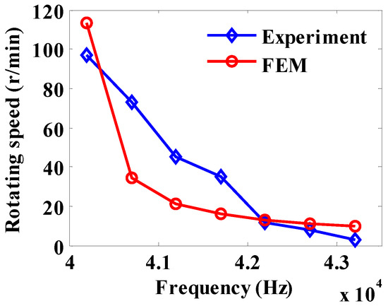 Figure 16 is a graph of the rotation speed n1 with frequency. The FEM rotation speed n1 is obtained according to a previous method [34]. The experimental and FEM methods are in good agreement. It can be seen from Figure 16 that the rotation speed of the motor decreases as the frequency increases.